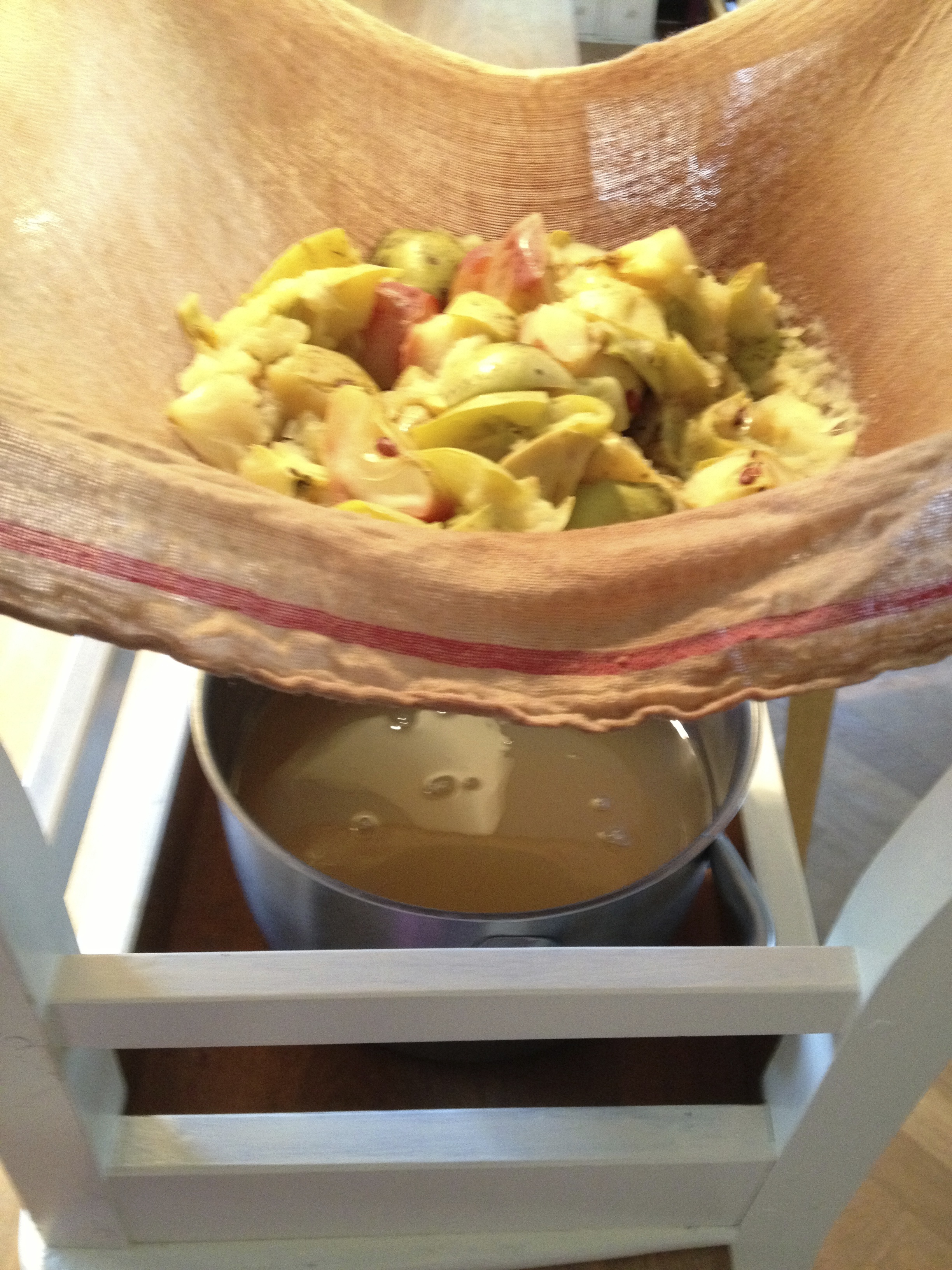 5. attacher une étamine aux pieds d’une chaise retournée, vider la casserole de pommes éclatées dans l’étamine, et laisser couler 12h