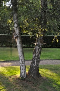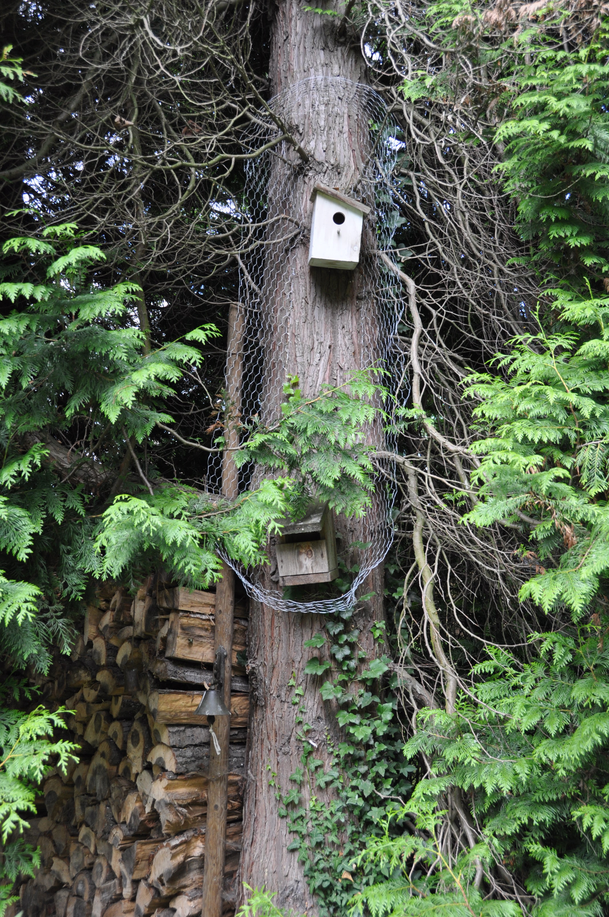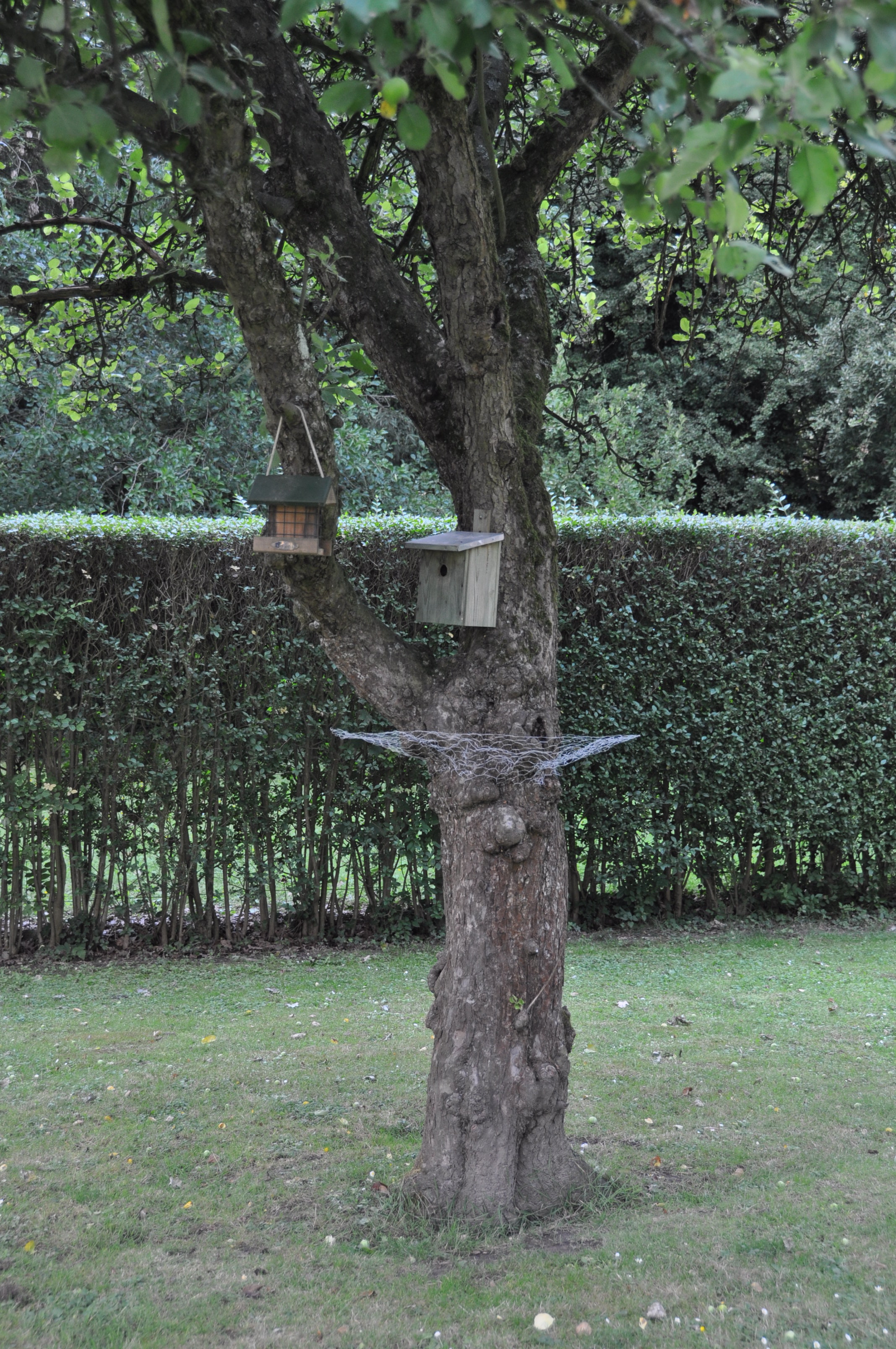 du treillis de poule fixé comme une collerette tout autour du tronc, pour rendre inaccessible les nichoirs 😉 Depuis lors, plus un seul oiseau ne revient dans la gueule de nos chats ! Il leur reste encore tous les petits rongeurs pour s’occuper pendant leurs chasses nocturnes …