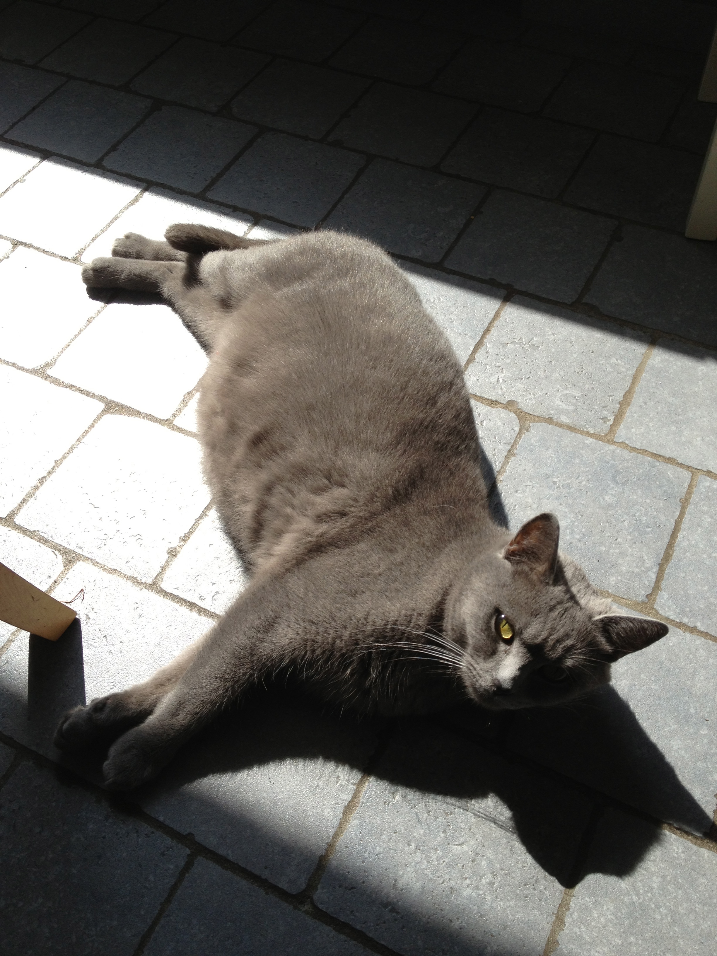 En rentrant de Londres ce dimanche soir, nous sommes avertis que Fanfan ne s’est plus montrée depuis le matin … Pas du tout inquiets puisque Fanfan connaît bien son domaine, nous nous activons pour ranger nos souvenirs des J.O. et nos réserves de biscuits et de thés anglais. C’est en arrivant à la cave, avec les divers biscuits, que nous entendons grogner ainsi que ronronner.