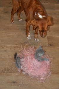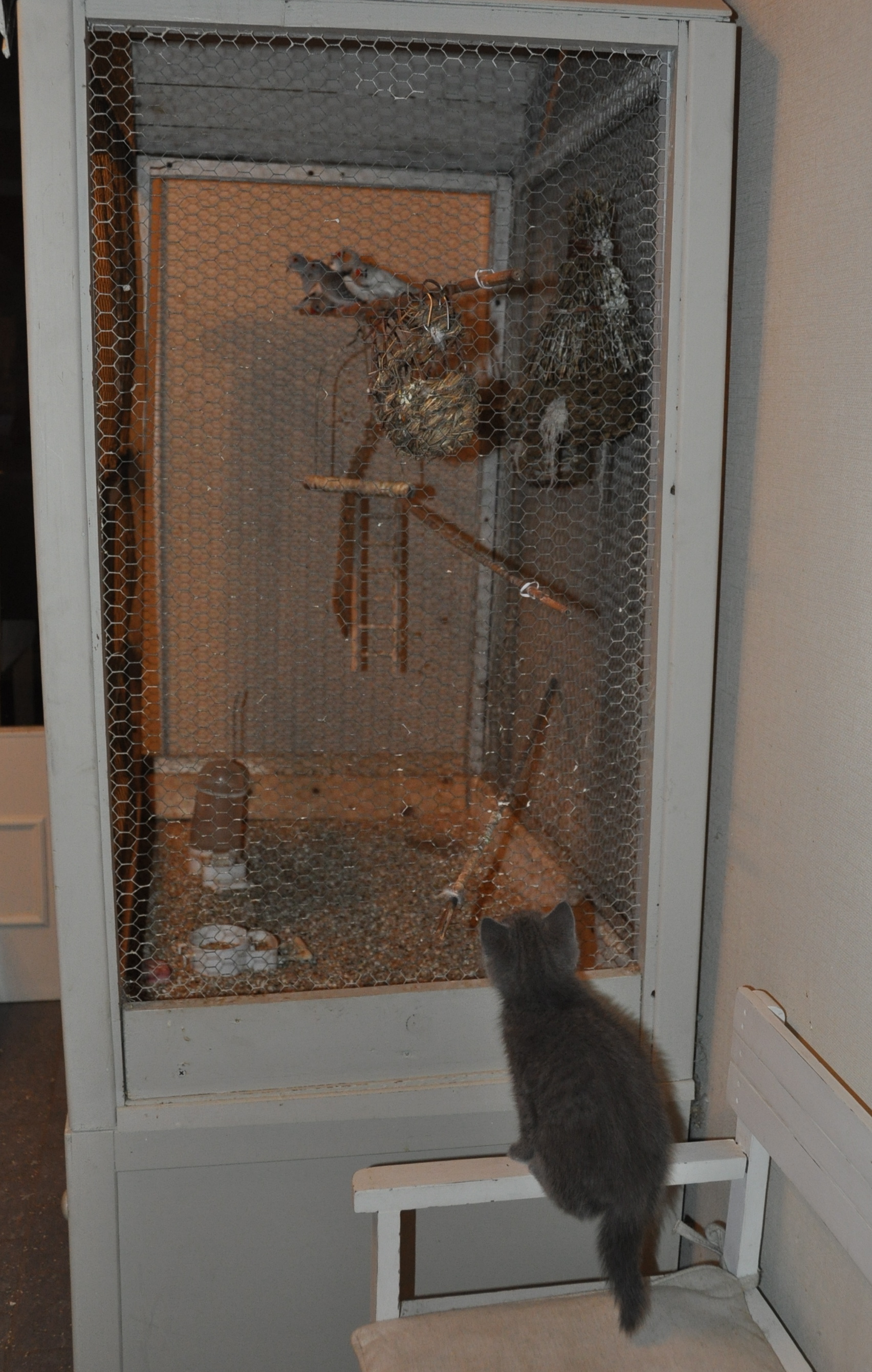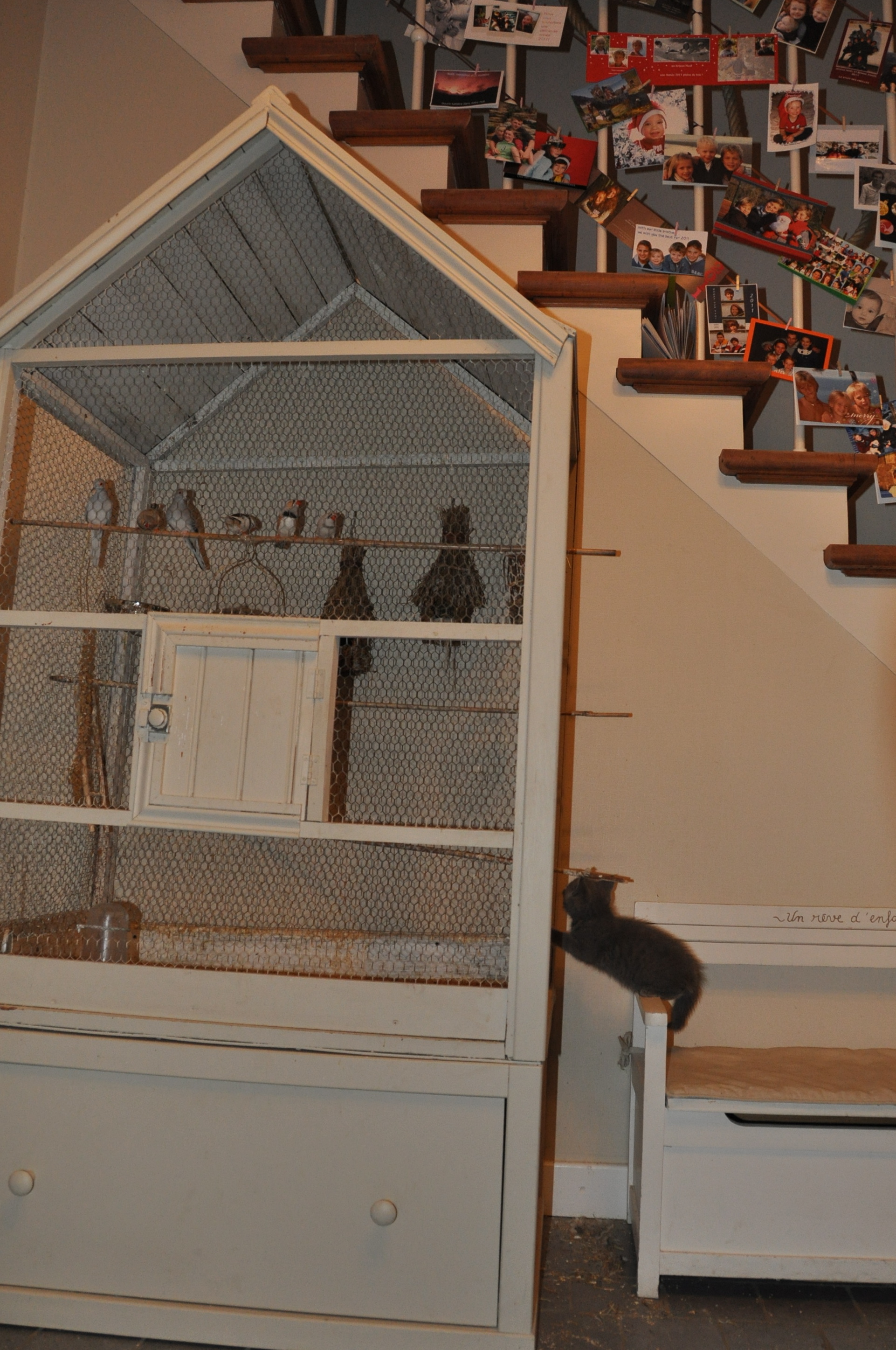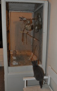 Et enfin les oiseaux… ça ! j’avais jamais vu de ma vie !!! ça m’intéresse fort, mais je dois ruser pour passer la porte quand mes maîtres ne la ferment pas assez vite … Zut, c’est raté pour cette fois-ci ! J’ai été pris par la peau du cou … et remis dans mon environnement !