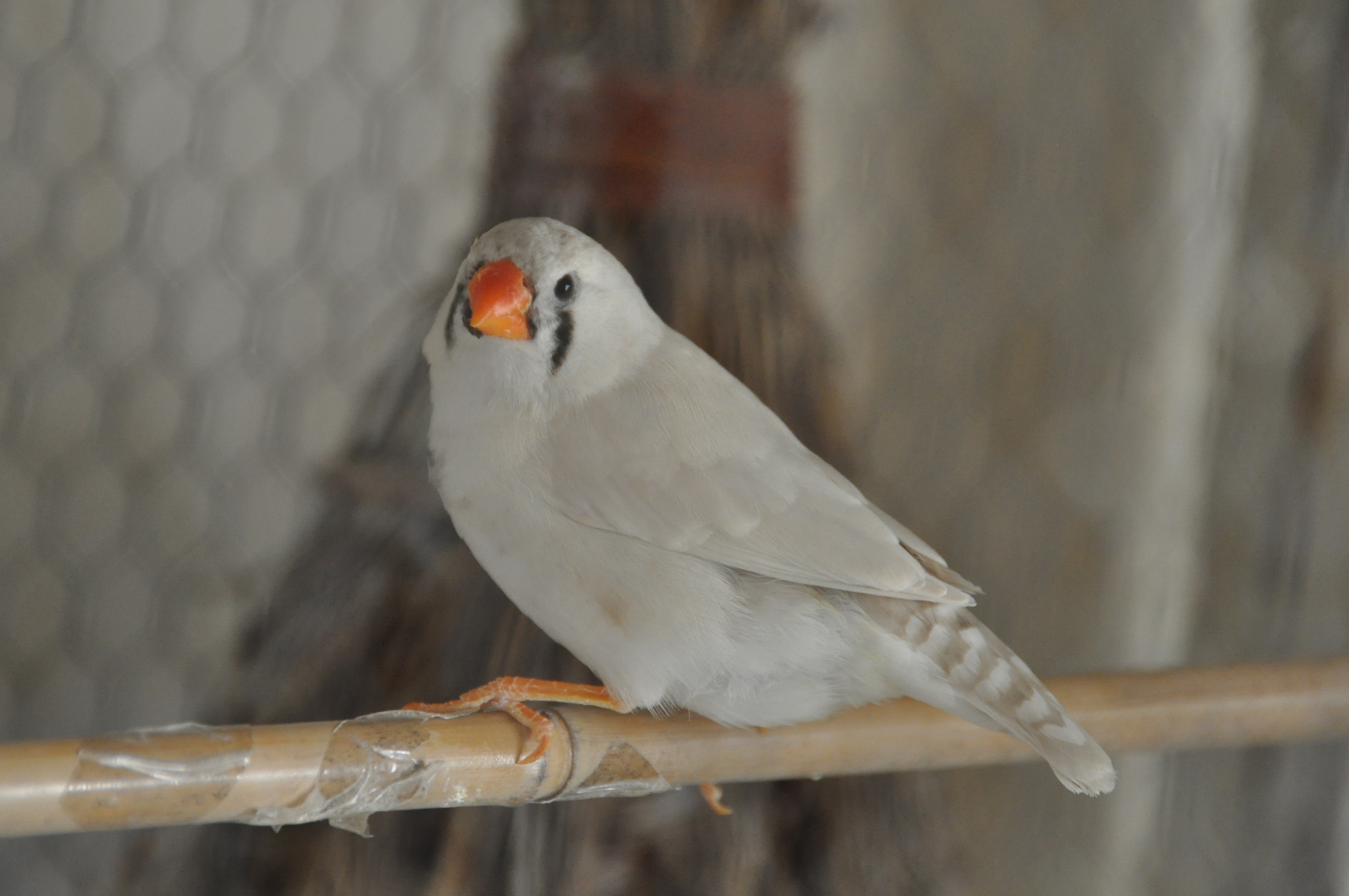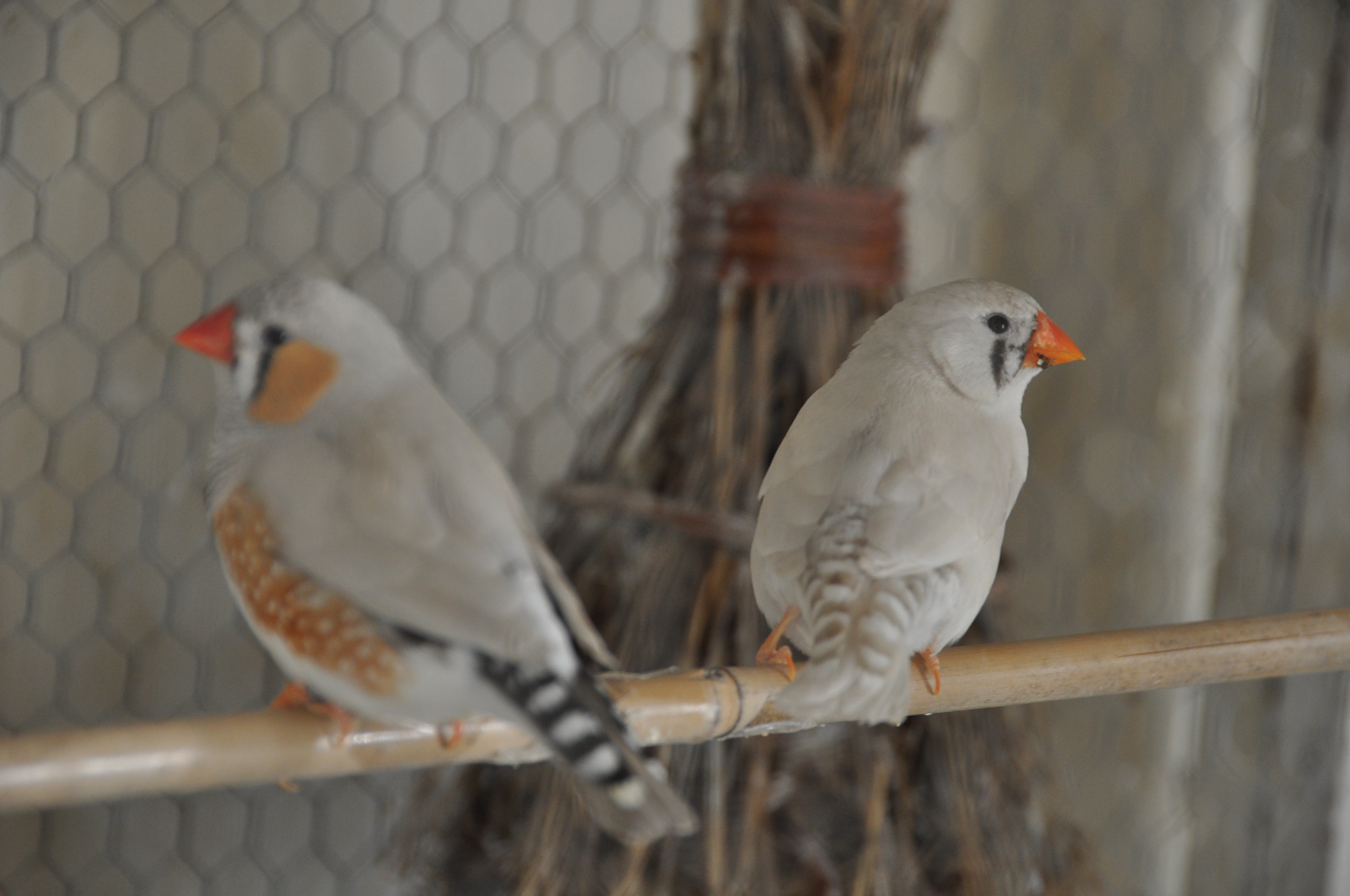 Une grande volière, « faite maison », préside dans le hall d’entrée. Nos petits chanteurs sont des mandarins, ainsi qu’un couple de cailles de Chine.