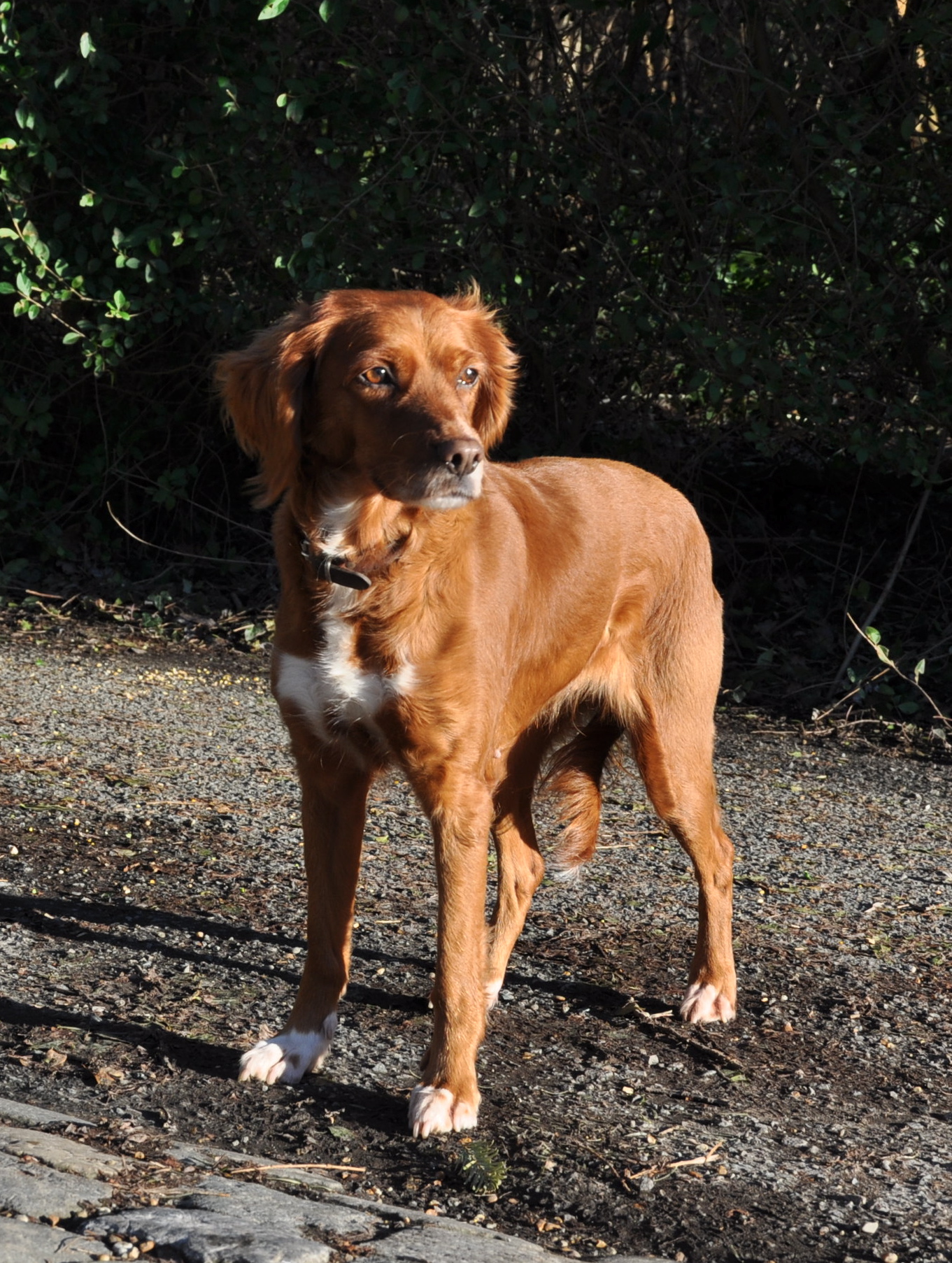 LAYA, croisée épagneul breton, (fauve, bavette blanche) femelle née le 1/08/07, adoptée en nov. 2010, et stérilisée le 24 août 2011. Elle est GRACIEUSE, MALIGNE et CRAINTIVE.